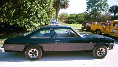 This is Mike O'Brien's 1978 Nova. It has a standerd bore 350 with flattop pistons, a .502" lift cam and TrickFlow heads. The trans is a TH350 with a Hughes 8" converter. Exaust is 1-3/4" Headman headers and 2.5" Dr Gas pipe with Dynomax Ultraflow mufflers. The rearend is an 8.5" 10 bolt with 4.56 gears and an Auburn posi unit. Future plans include an 8 point rollbar, cowl indution hood and Centerline Worrior wheels.