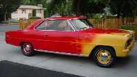 Gerald Wood owns this best paint and graphics award winning 1966 Nova. The paint is Sikkens Red with yellow flames and lavendarpinstriping. The car has a new black interior, new weather stripping around doors, windows and trunk. The engine is a 1994 350 ZZ3 H.O. motor with 375 h.p., MSD igition, 750 Holley, Sanderson headers, Flowmaster exhaust, TH350 trans with 2300 rpm converter, Auburn Posi rear-end with 3.73 gears. The wheels are Billet Specilties (15x6 front, 15x7 rear) with BF Goodrich T/A Radials. It also has a new Air Lift suspension by Easy Street and power disc brakes by CPP.