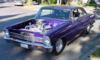 This is John H.'s 1966 Pro Street Nova. It has a 502 big block with Brodix aluminum heads, a BDS 8-71 blower, a pair of Holley Dominator carbs and an Art Carr TH400 trans with a manual valve body. At 5% under-driver it puts out 750-hp. The front has coil-over shocks, disc brakes and rack & pinion steering. The rear is a Chrysler posi with a 4-link and coil-overs. The entire body is all metal.